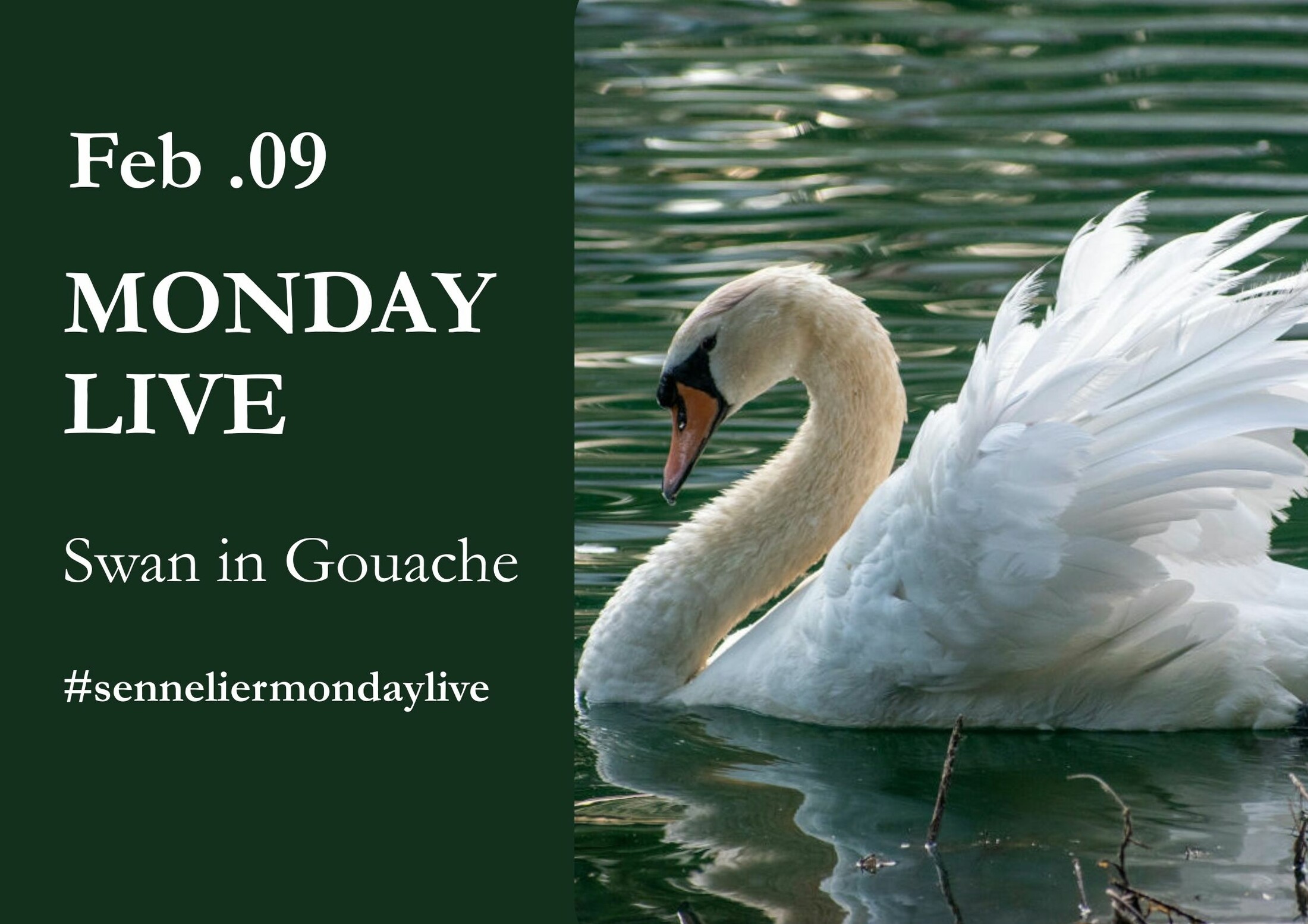 For this February 9th Monday Live , we are going to paint in gouache a sumptuous swan. A very interesting subject to practice gouache through the whiteness of the plumage, the volumes of the swan, and the green reflections of the lake.